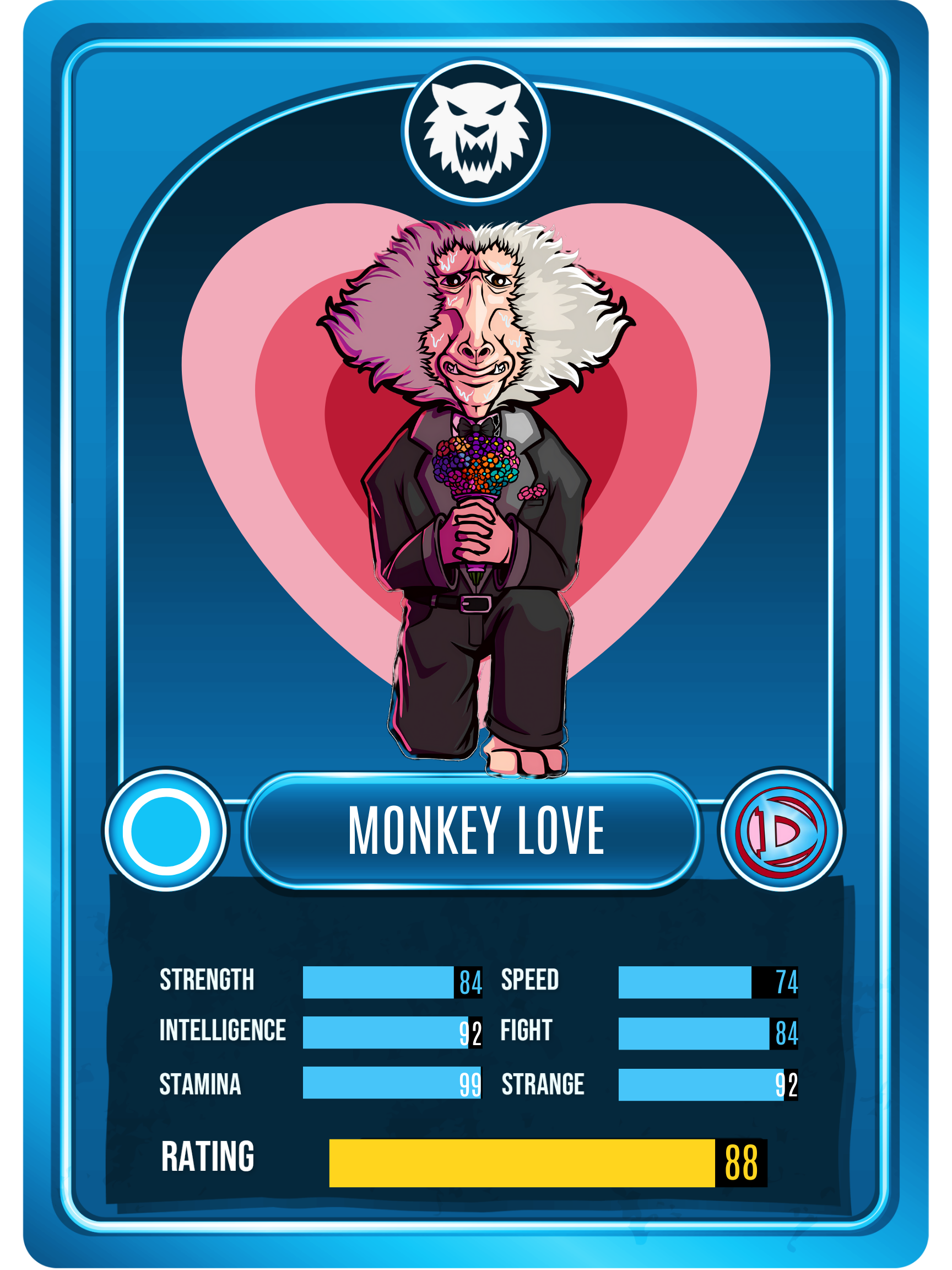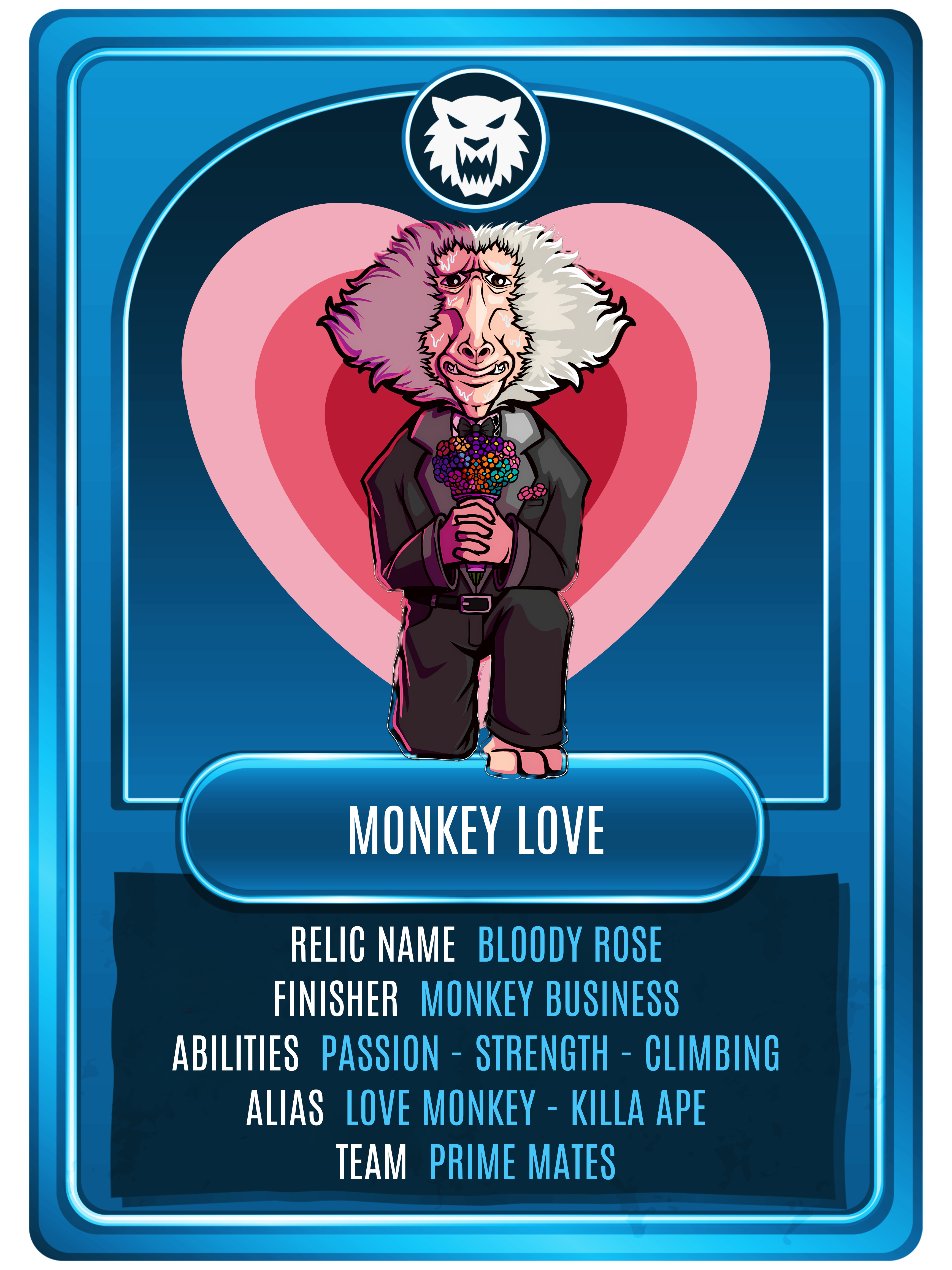 Monkey Love, a true romantic, delivers gifts of affection to loved ones. If unworthy, upon accepting the gift, his band of monkeys will maul the target mercilessly. He crusades against those who do not cherish love. Monkey Love has been described by many as, "Aww. Wait, wait, ahh ahh AHH AHHHH."