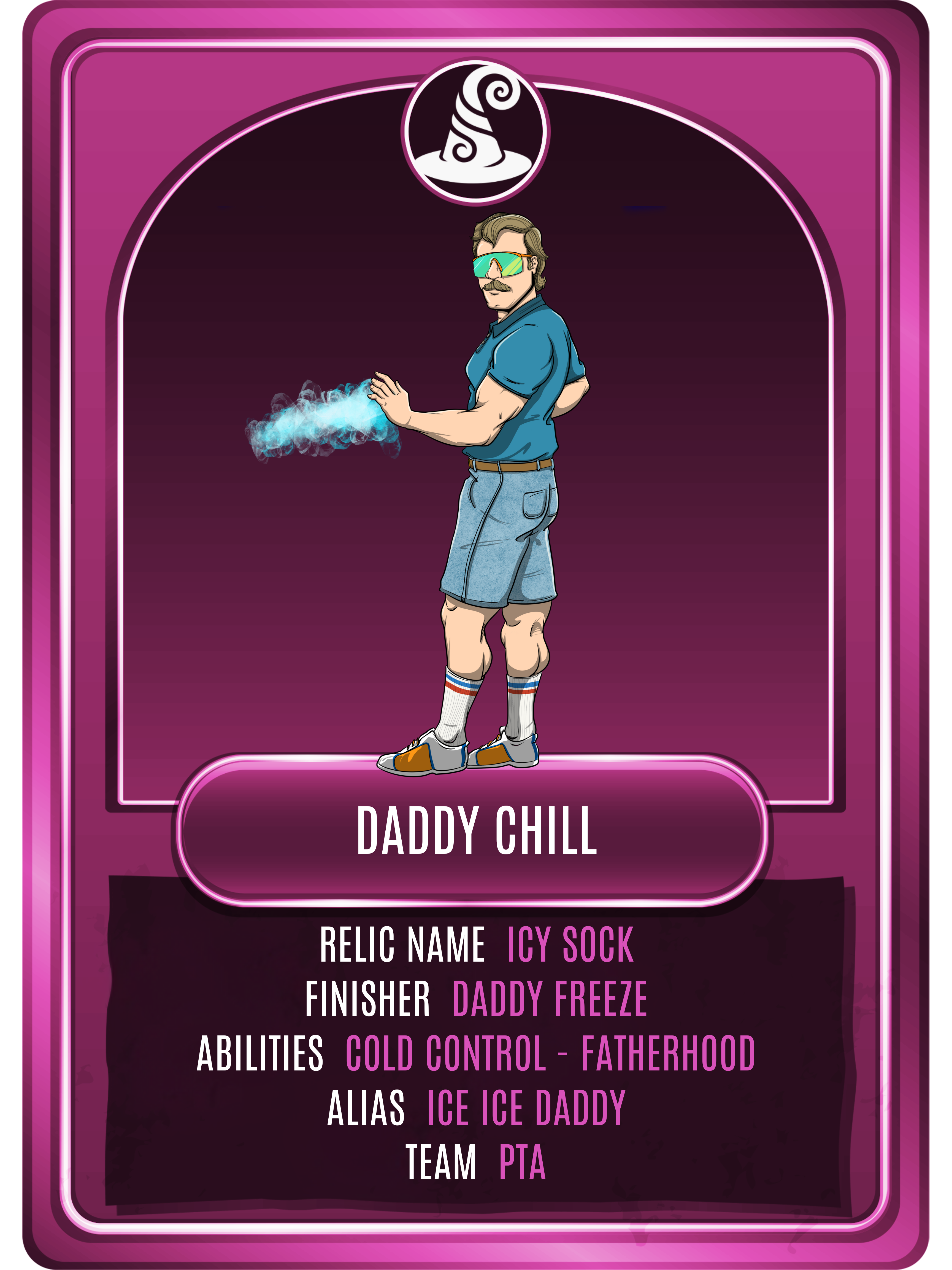 Daddy Chill once harbored the hottest temper in the Northern Hemisphere until icy waters and an ancient creature gave him new direction and freezing powers. In his rebirth, he stays cool while raising a family, though the fire still lives deep within. Daddy Chill has been described by many as, "a man popsicle."
