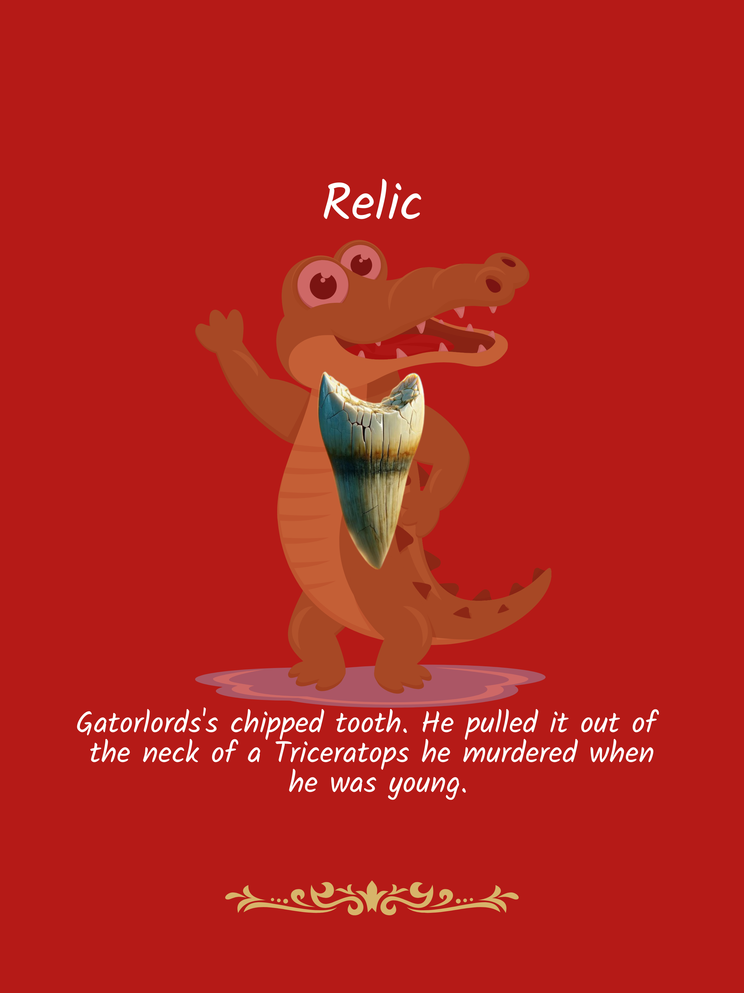 “They say the lion is the king of the jungle…” Gatorlord spoke to his gatorlings as if telling a bedtime story. “...but I’ve eaten plenty of lions…” he paused and took a deep breath, his snout just over the water, sending a ripple across the water and steam rising from it. “...and I never once choked on a crown.” He stared, proudly recounting hundreds of years of misdeeds around the world as a young gator.