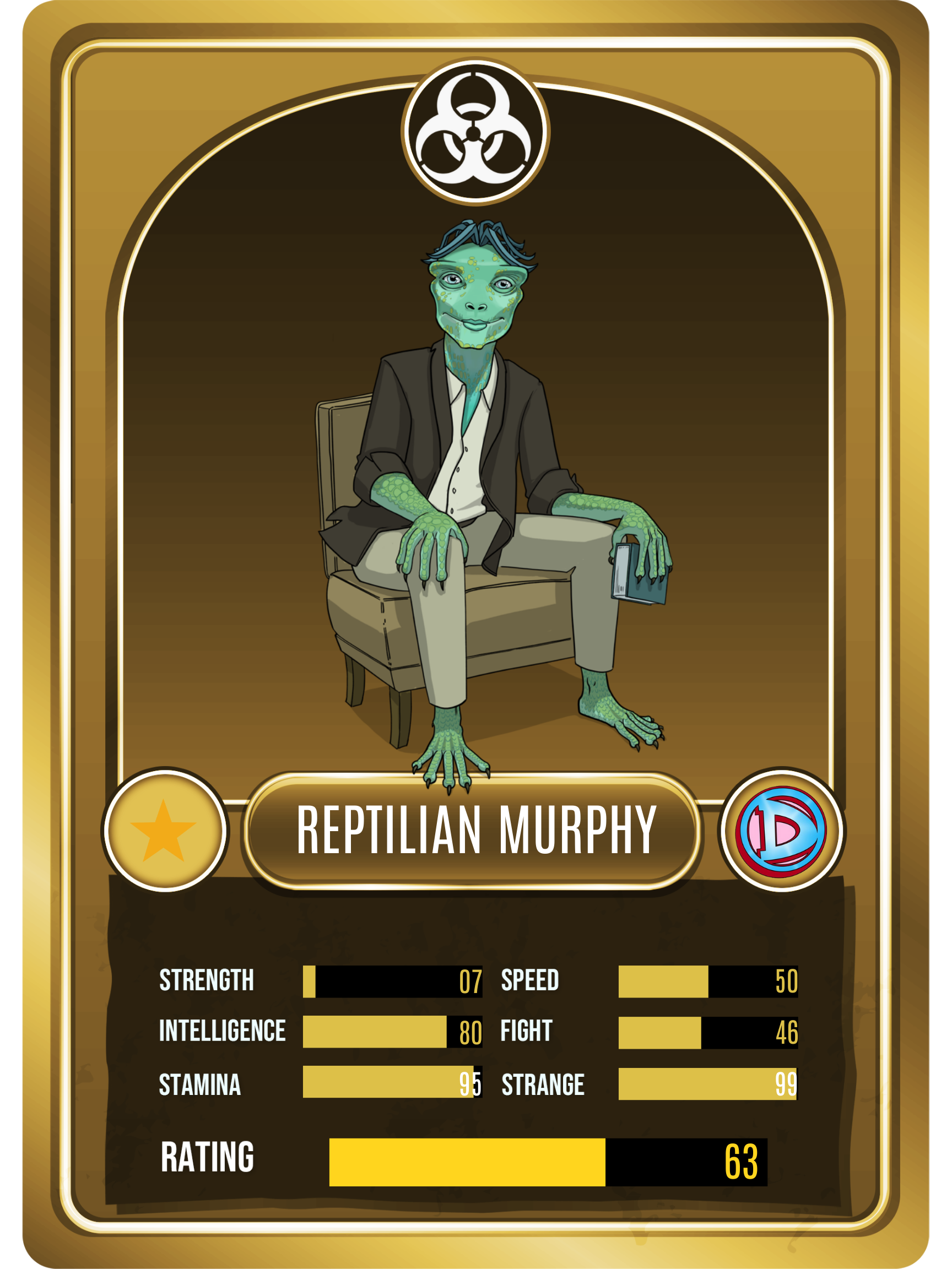 Reptilian Murphy proudly graces the big screen as a brand new creature. With all the prolific acting skills of his former self, and the powers of a magical reptile, he is called on to play any role that could use a scaly green thing. Reptilian Murphy has been described by many as, "a reptile dysfunction."