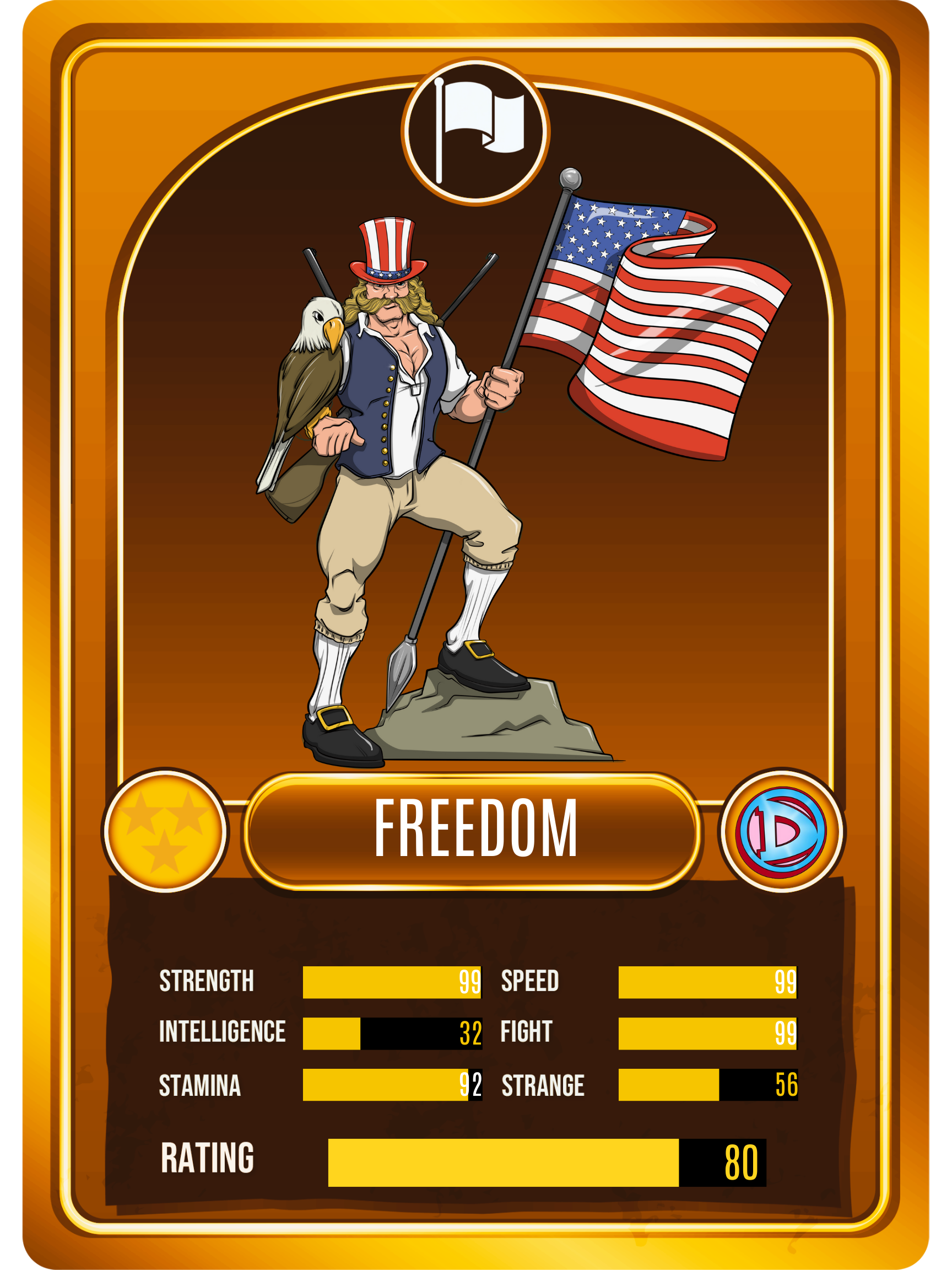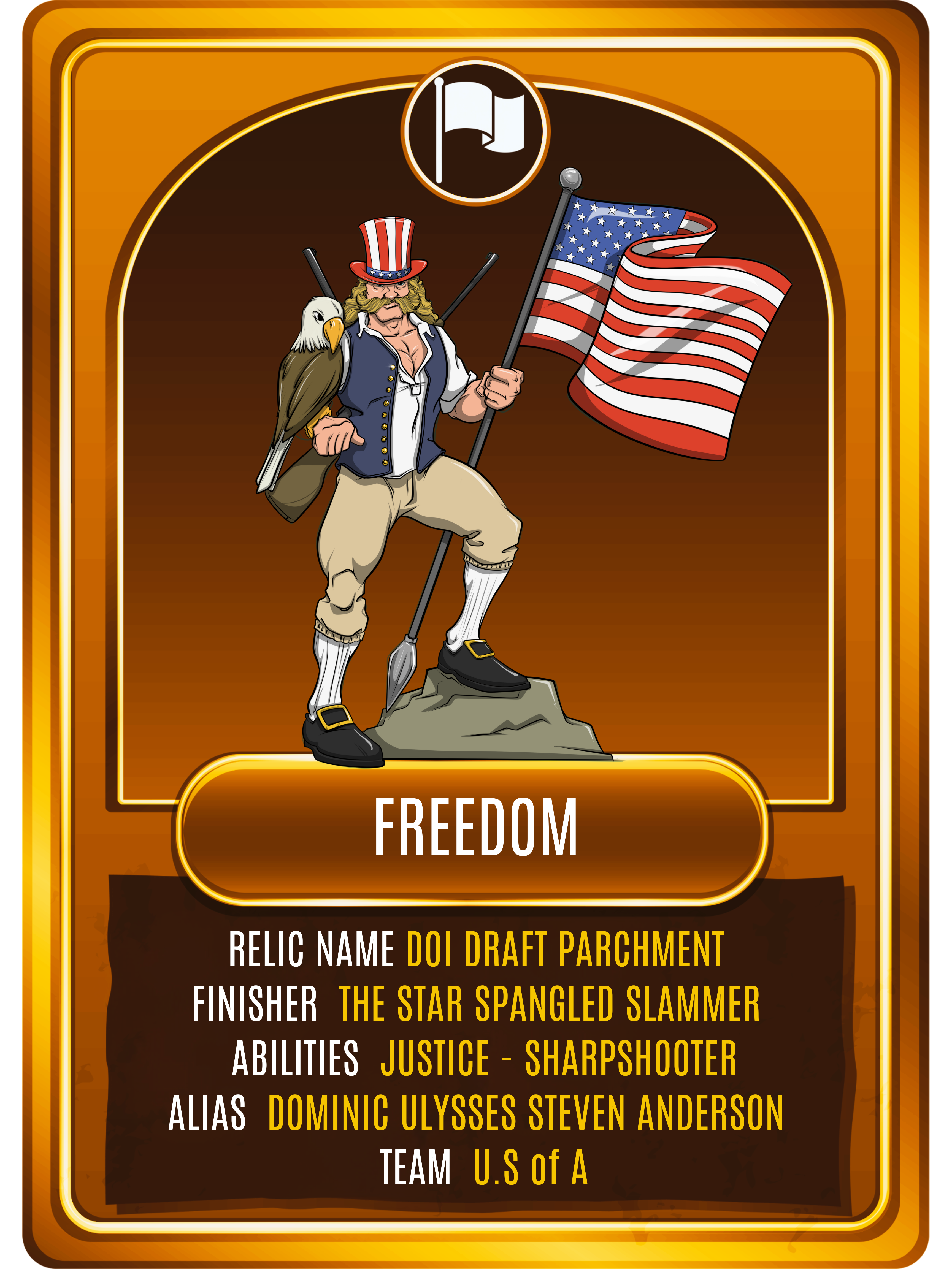 FreeDom is the embodiment of everything American. Able to become a bald eagle on command, flying the colors of liberty behind him, he is a true symbol of the free world. Though he was a large part of the forming of the nation, he has earned no credit. FreeDom has been described by many as, "a good ol boy."