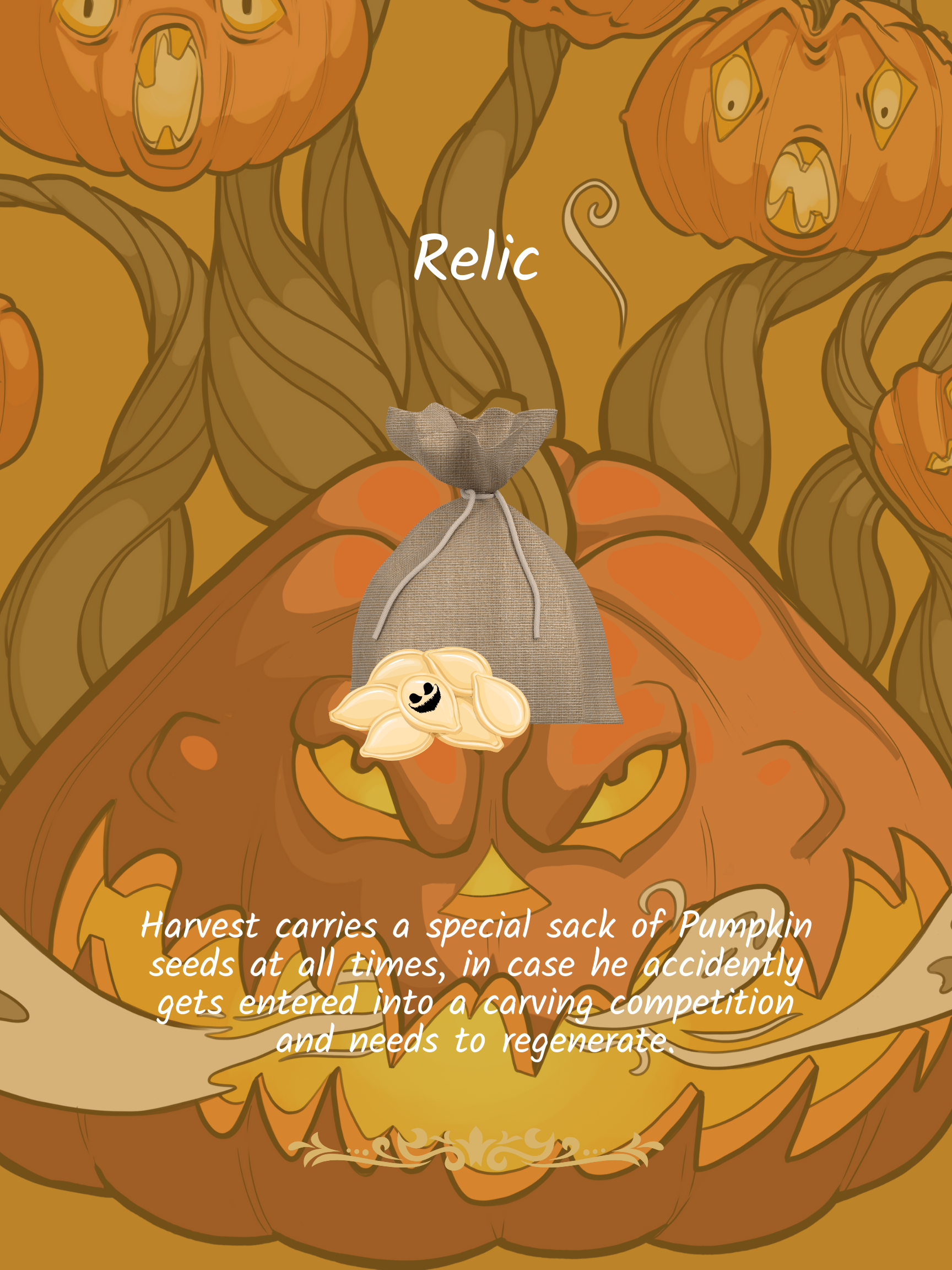 Harvest is a soul-stealing spirit within a monstrous pumpkin who turns his victims into small pumpkins, fated to live in terror for eternity. Anyone foolish enough to try to aid the screaming prisoners is grabbed by spirit tendrils and transformed. He drains the area where he rests of all energy and life. Harvest has been described by many as, "a real jerk."