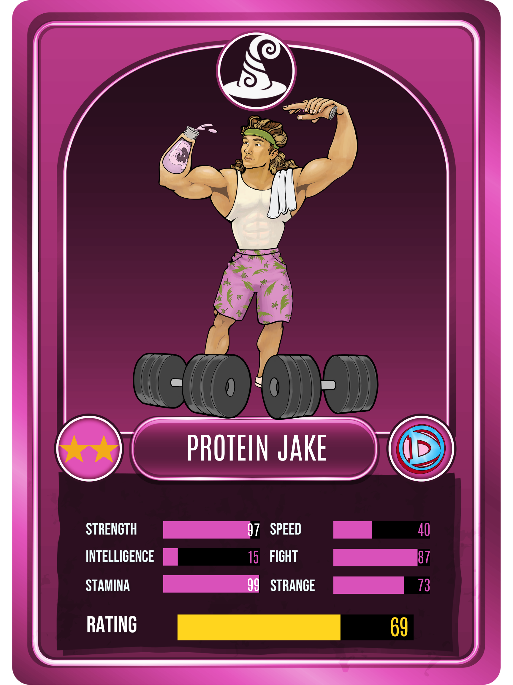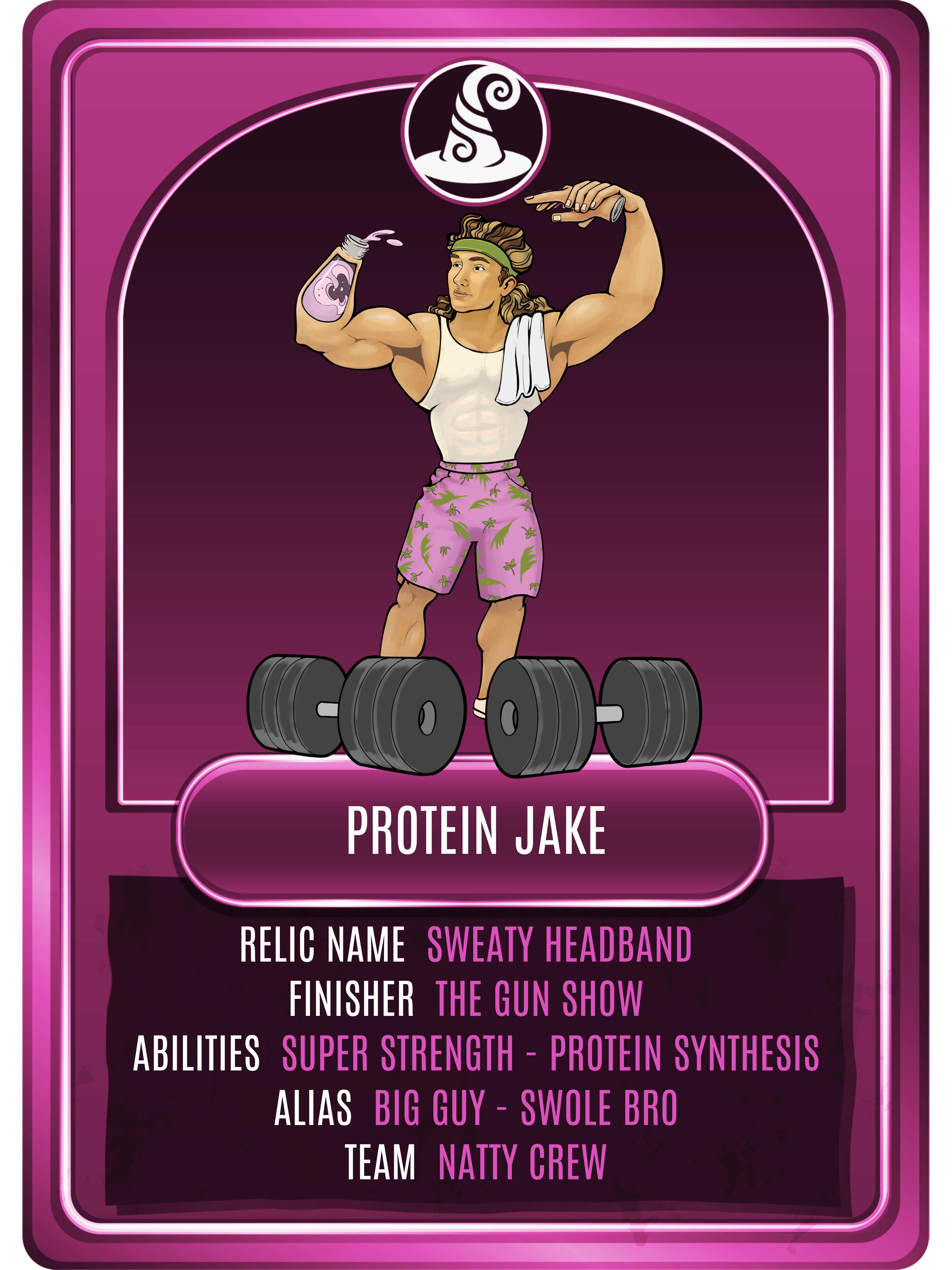 Protein Jake is the ultimate gym bud. Sporting a built in protein synthesizer, he is able to convert the constant replication of protein within his stomach into usable, shareable, delicious shakes. With this power, he can gain muscle at will through months of intense weight-lifting. Protein Jake has been described by many as, "lookin' big, king."