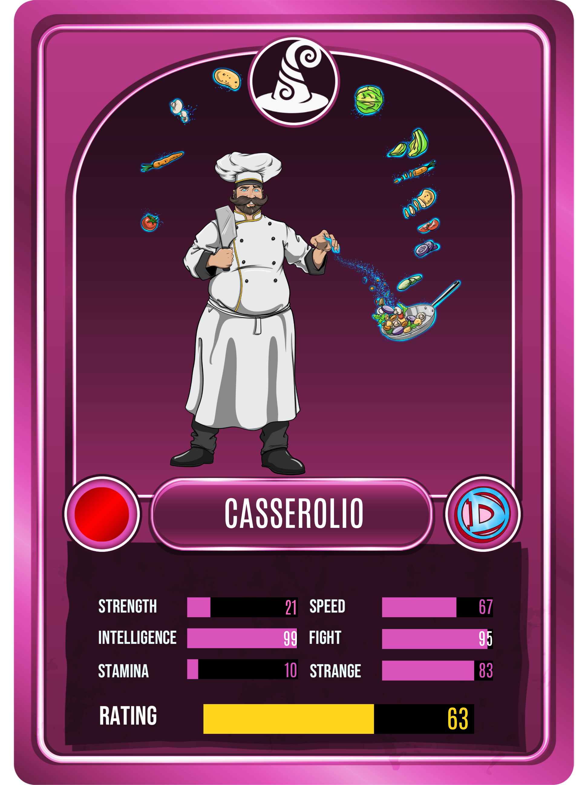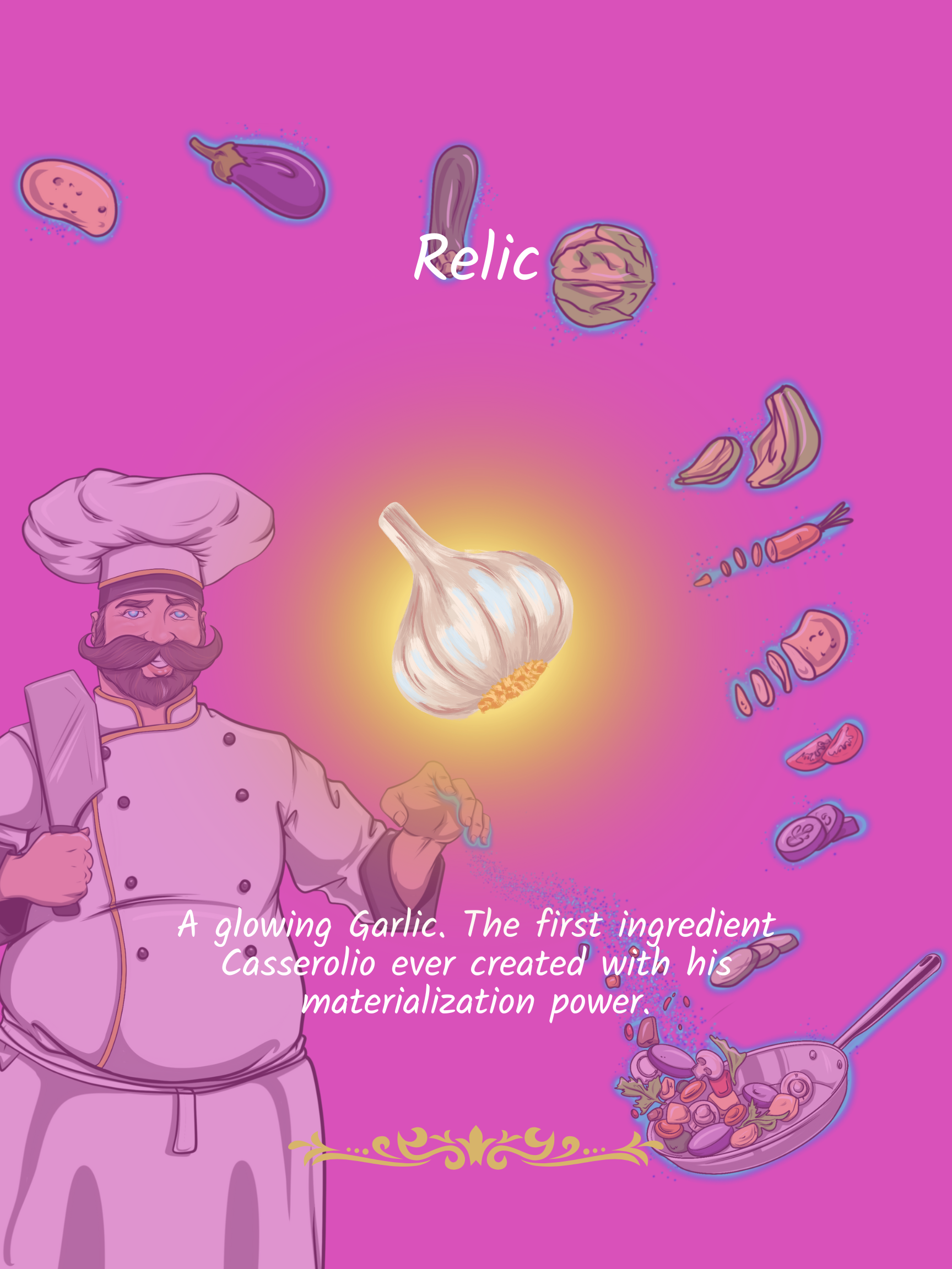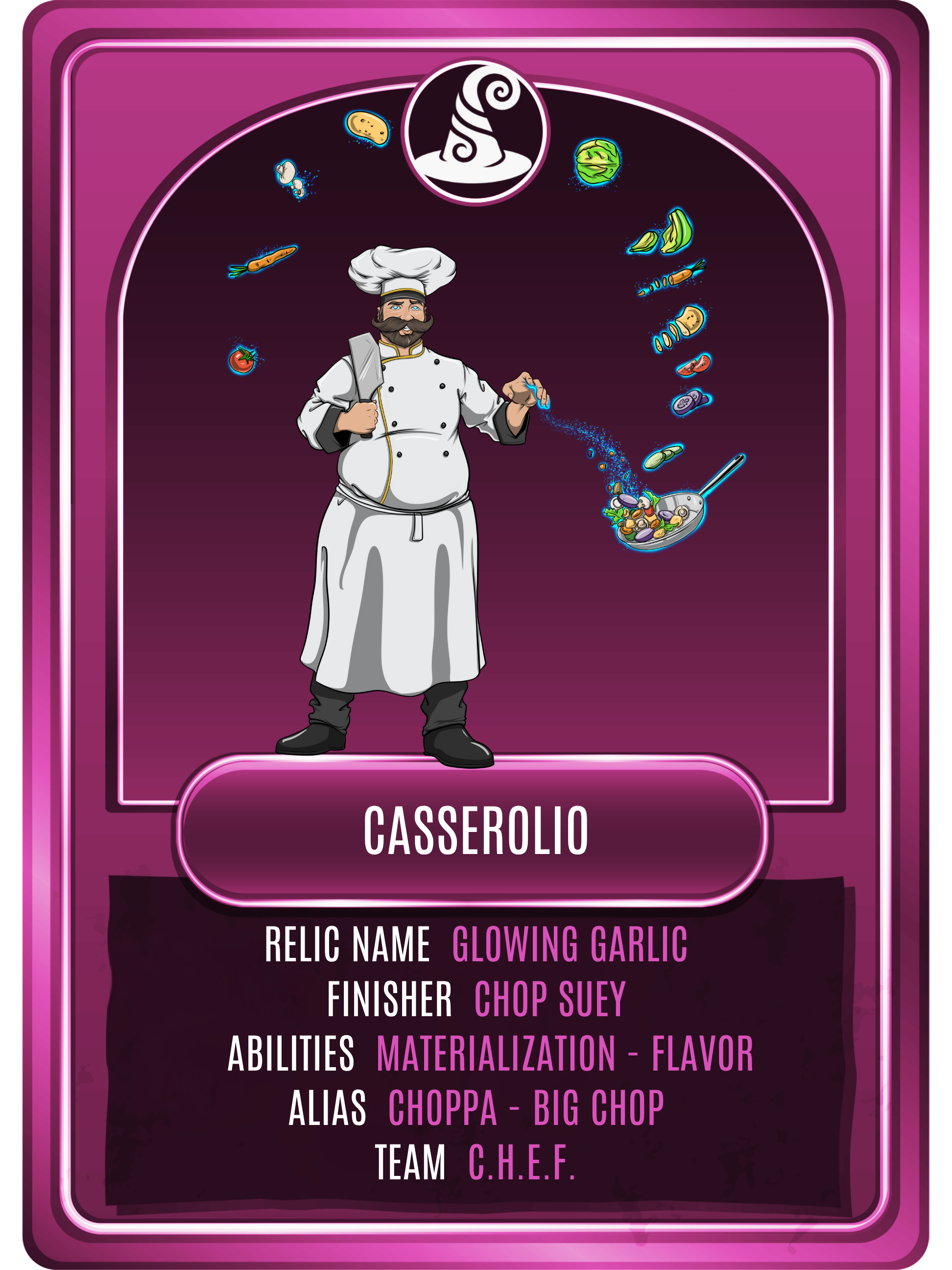 Casserolio is a passionate chef who can materialize food instantaniously out of thin air. With a passion for flavor and a love for ingredients, he can always be relied on when it comes to a recipe for success. His cleaver once belonged to his father, an inspiration for his path in life. Casserolio has been described by many as, "I'll have another."